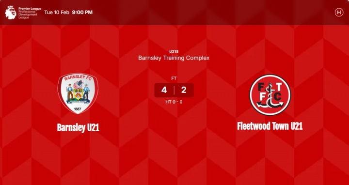 该媒体透露,本周二结束的职业发展联赛,巴恩斯利U21以4-2逆转击败弗利特伍德U21,徐彬在本场比赛出场。巴恩斯利U21下场比赛将在北京时间2月17日(大年初一)21点进行,巴恩斯利U21客战哈德斯菲尔德U21。
