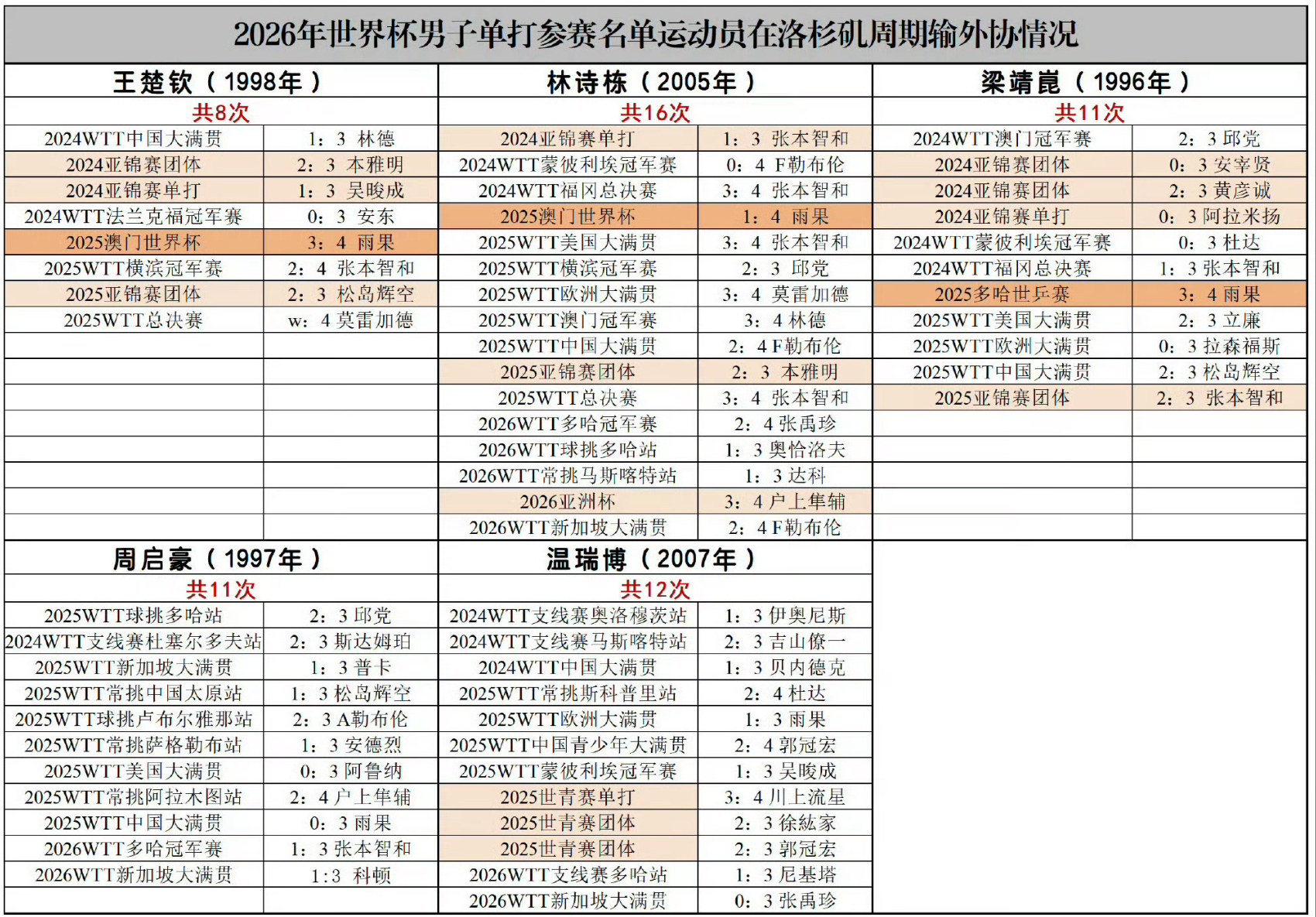 2026年世界杯男队的名单:王楚钦、林诗栋、梁靖崑、周启豪、温瑞博,但这几人都没有拿过世界杯冠军,而樊振东有4个世界杯冠军。