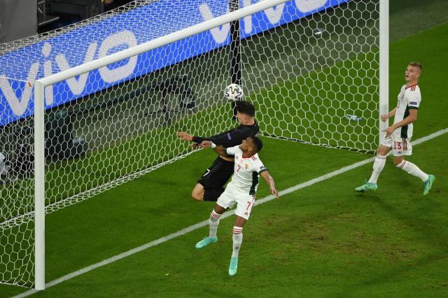 德国原本可以利用匈牙利急于求胜的心态打反击,但勒夫的球队选择了全线进攻,结果反被匈牙利人靠反击得分:开场11分钟,匈牙利打出反击,罗兰·绍洛伊右路斜传,亚当·绍洛伊俯身头球攻门破网。领先之后的匈牙利全力封堵德国队两侧的传中,德国队面对葡萄牙时那种两翼的传球完全无法打出。匈牙利则利用基米希助攻时在右路留下的空当,打出了多次的反击。